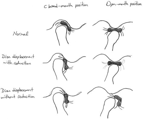 Disc displacement with reduction. The articular disc is displaced anteriorly (forward) at rest, when the mouth is opened the disc relocated onto the condylar head. These patients may have a click during opening. Protrusion usually stops this click. They have little or no reduction in range. This is typically associated with a deviation (middle-out-middle) during opening as the disc reduces.